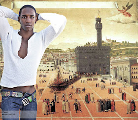 A black guy has materialised next to the fountain and is taking pictures of the Loggia, meaning he’s taking pictures of me taking pictures of him taking pictures of me and so on. It would be a new come-on for me, and the fun part is in the wuzzy reciprocity—who is to say who is coming on to whom? Whether the guy is actually aware of my presence remains to be seen (the Loggia holds a dozen statues and six dozen sightseers as we speak), but I am becoming increasingly aware of him, unmistakably. I’m a natural.
